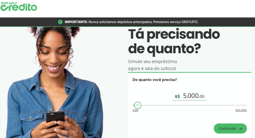 Está precisando de grana rápida, com ótimas condições e sem complicação? O empréstimo Bom pra Crédito pode ser a solução perfeita para você! Com acesso a mais de 50 financeiras parceiras, a plataforma liga você às melhores ofertas de empréstimo do mercado, com taxas a partir de 1,09% ao mês.