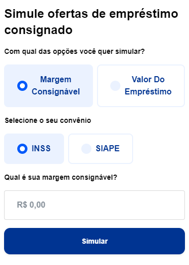 - No formulário, escolha entre simular um empréstimo pelo valor ou pela margem consignável;