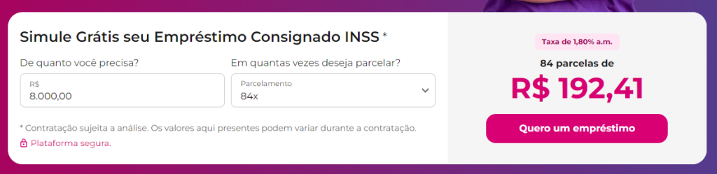 Com o empréstimo consignado Meu Tudo, você desfruta de muito mais facilidade no pagamento. Afinal, ele apresenta juros de apenas 1,80% ao mês e um prazo de pagamento de até 84 meses.